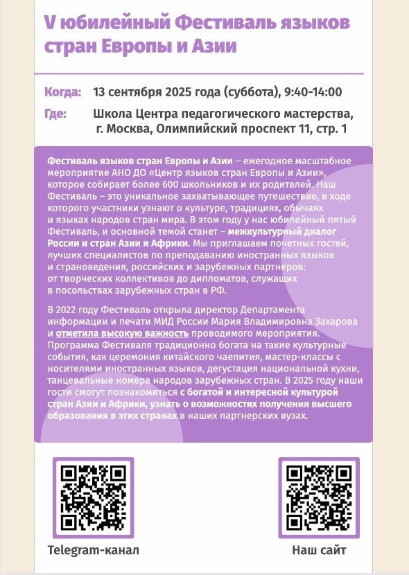 Основное вступительное испытание пройдет в очном формате 13 сентября 2025 года (суббота) в рамках V Фестиваля языков стран Европы и Азии по адресу г. Москва, Олимпийский проспект, дом 11 строение 1. Для участия необходимо: